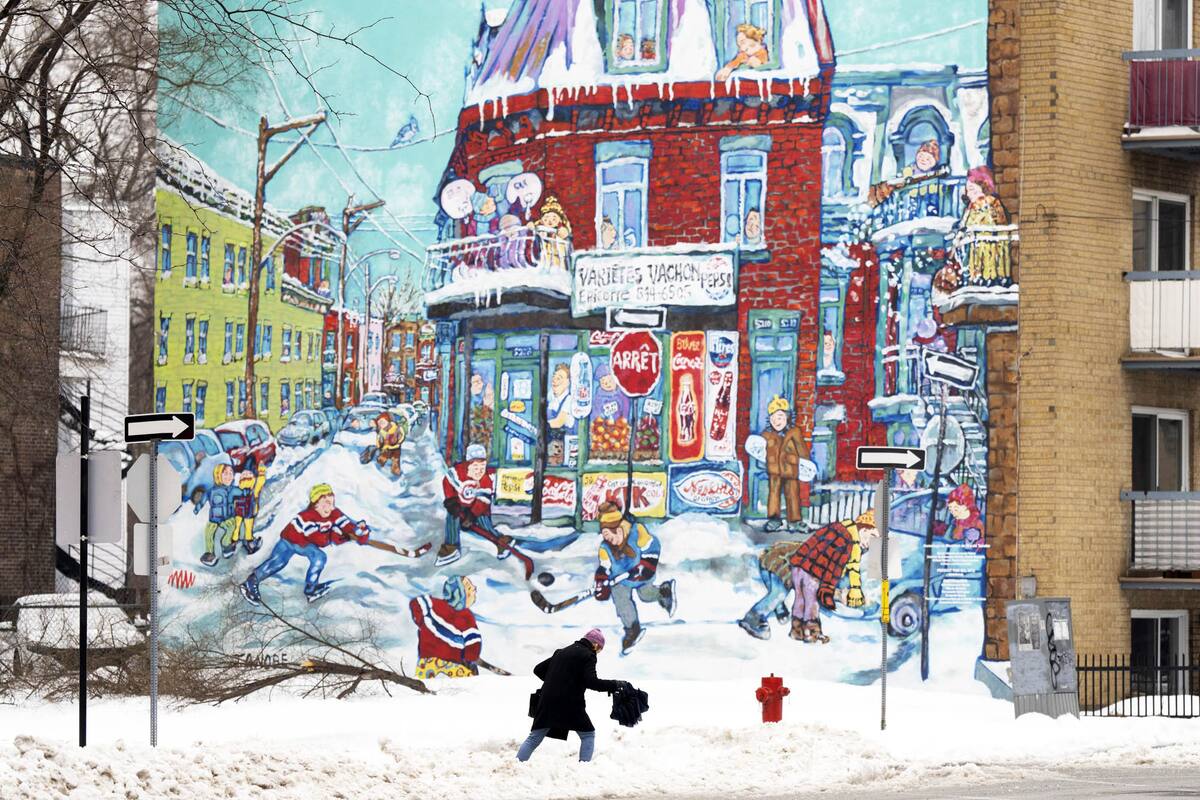 Se diría una postal. Se diría una esquina donde, en lugar de dos calles, los que se encuentran son dos universos, el de lo real, el de la fantasía. Desde este lado del mundo, Montreal es sinónimo de festivales de jazz y de cine, zona de encuentro de miradas, voces, lenguas. Territorio con fama de amable salvo por los rigores del invierno, algo que bien puede intuirse en esta foto. La nieve cayó sin pausa, la vereda –por la que avanza una mujer abrigada de pies a cabeza–permanece cubierta, y el manto blanco acumula unos cuantos centímetros de obstáculo helado. Sobre la pared, cubriendo toda la fachada como la ropa de abrigo cubre a la transeúnte, un mural que podría estar sacado de una caja de chocolates. Dibujos, colores, calidez ligeramente vintage, espíritu de historieta y los mil detalles de un pueblito alternativo, plácido en desplegar un vida que bien podría ser así de afable.