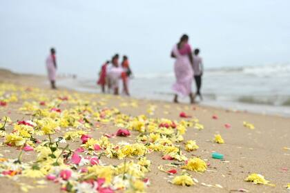 No es solo un puñado de flores lo que se despliega en primer plano: es la voluntad del ritual, el ejercicio –siempre obstinado– de una memoria incapaz de hacer retornar a los que se fueron, pero necesaria para cualquier tipo de reparación. En diciembre de 2004, las paradisíacas playas de Tailandia, las costas de Indonesia, Malasia, Sri Lanka e India se convirtieron en un infierno hecho de eso mismo que por lo común es fuente de vida: agua; las aguas más bellas –quizás– del planeta. Un terremoto submarino extraordinariamente fuerte e inusitadamente largo convulsionó al Océano Índico y provocó una serie de tsunamis devastadores. Unas 220.000 muertes, infinidad de personas desaparecidas, enclaves turísticos arrasados, poblados destrozados. Una herida profunda, que estas flores arrojadas en la playa Pattinapakkam Chennai, India, intentan mitigar.