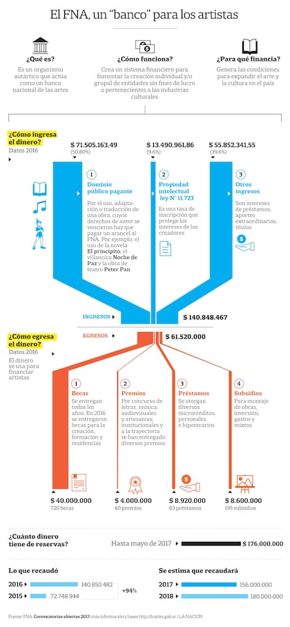 Al contrario de lo que popularmente se cree, el uso de una pieza cinematogáfica, musical, literaria -cualquier sea-, cuya protección de derechos de autor se venció, está gravada con un arancel que el FNA recauda de manera directa (por cuenta propia, como en el caso editorial) o indirecta (a través de Sadaic, Argentores, Capif, DAC y otros agentes). Es decir, que si bien es libre la utilización del texto de El principito, el guión de Peter Pan o la imagen de El Moisés de Miguel Ángel -por citar un puñado de grandes éxitos de autores muertos hace ya más de 70 años-, su reproducción, traducción o adaptación tiene que abonar un arancel. La alícuota es mínima (del 0,3 al 3 por ciento del valor comercial), pero el universo es tan grande que constituye el mayor ingreso de dinero que el Fondo reparte en becas, concursos, subsidios y préstamos para artistas: sus cuatro principales vías de acción. Los números son muy ilustrativos: el dominio público pagante representó, en 2016, el 50,82% de la recaudación total del FNA, es decir, $ 71,5 millones de pesos.