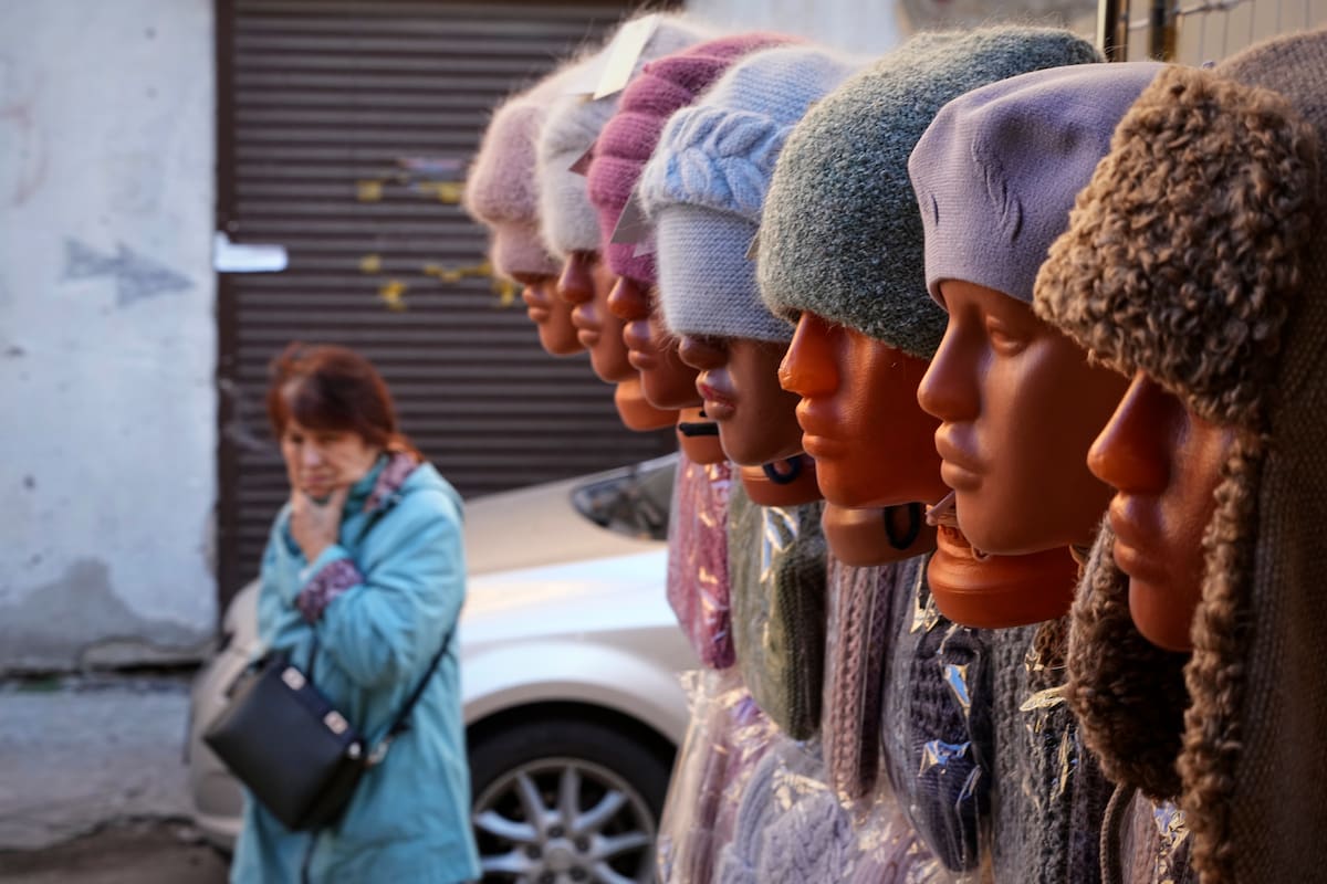 Desde que Sigmund Freud lo definió, sabemos que lo familiar siempre anida en lo siniestro. Y viceversa. Dobles, autómatas, antiguas muñecas de trapo o porcelana: objetos privilegiados para alojar cierto tipo de inexplicable estremecimiento. Los maniquíes –y qué decir de sus descendientes, los robots antropomórficos– forman parte de esa singular cofradía. Así lo vemos en esta foto. ¿Qué más cercano, aquí o en la ciudad rusa donde están, que una hilera de maniquíes luciendo sombreros y gorros a la venta? La mujer que los observa no muestra terror, sino cálculo: probablemente esté evaluando costos, calidad, necesidades. Y sin embargo, ¿qué más inquietante que unos perfiles iguales y a la vez distintos al de cualquier ser humano, plástico decapitado y mudo, que no mira a nadie pero está allí: una hendidura extraña entre tanto objeto cercano.