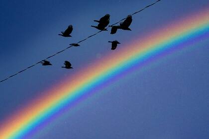 Placentia, EE.UU.- Una bandada de cuervos surca el cielo delante de un arcoíris. Es singular poder fotografiar el arcoíris en pleno esplendor. Y más lo es captar el instante en que un grupo de aves se atraviesa entre la mirada y este fenómeno óptico. A su vez, esta coincidencia no es lo único destacable aquí. Es posible ver cómo se proyectan sobre el firmamento dos símbolos de significados culturales diametralmente opuestos: los cuervos, asociados a lo largo de la historia con los malos presagios, con la muerte, por tratarse de aves carroñeras. Y el arcoíris, que representa la esperanza, la alianza entre cielo y tierra, la existencia de un futuro promisorio, opuesto al futuro incierto o inexistente que se asocia a la presencia funesta de esas aves oscuras. Sí, la lectura de esta imagen está cargada de subjetividad. Sin embargo, el futuro de todos se debate hoy mismo entre ambas interpretaciones, más allá de toda duda.