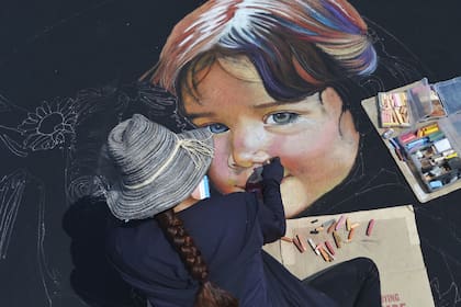 Su familia es la del street art, los murales callejeros, incluso las esculturas de arena (como ellas, están destinadas a desaparecer rápidamente y sus creadores suelen plasmarlas en alguna que otra peatonal, en algún enclave del verano). Son retratos, paisajes, fantasías y postales dibujadas sobre el asfalto con ganas, tizas de colores y concentración a prueba de multitudes. Todos las hemos visto alguna vez, esporádicas y luminosas. Pero en St. Joseph, ciudad de Michigan, Estados Unidos, se las tomaron muy en serio. De allí, el festival Chalk the Block, que reúne artistas habituados a transitar entre el pop y la cultura urbana; sobre todo, amigos de dejar a sus criaturas suspendidas en los más diversos rincones de las más diversas ciudades. De eso sabe Jennifer Ripassa, descubierta por el fotógrafo en pleno despliegue de colores, tizas y creatividad.