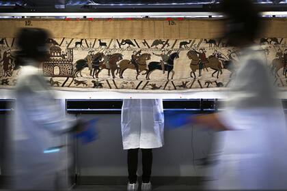 A ciencia cierta, no se conoce el nombre de quienes, en algún momento del siglo XI, lo hicieron. Tampoco se sabe cuánto tiempo tomó forjar, hilo a hilo, cada una de sus figuras. Ni las posibles discusiones en torno a sus motivos, disposición, diseño. El tapiz de Bayeux, una enorme pieza medieval de unos 69,55 m de largo, 50 cm de altura y peso aproximado de 350 kg., es único por sus dimensiones, por la combinación de técnicas que implicó su realización, por el pulso histórico que lo anima: la conmemoración de hechos previos a la Batalla de Hastings y la conquista normanda e Inglaterra. Alojado celosamente en el Museo del Tapiz de Bayeux, en Normandía, el tapiz se prepara para emprender un viaje tan histórico como todo lo que lo rodea: en el marco de un acuerdo de préstamo entre Reino Unido y Francia, a partir de 2026 será exhibido en el Museo Británico.