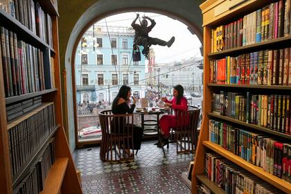 El trabajo de un limpiador de vidrios no es cualquier trabajo. Cada tanto los vemos, suspendidos a veces a alturas impensables, aparentemente cómodos –sin duda sin vértigo–: un ser humano apenas bamboleante sobre su sillín, dejando impecables los ventanales de rascacielos, edificios más o menos elevados, espacios abiertos a lo aéreo de cada ciudad. En el caso de esta imagen, la altura no parece ser tanta, aunque la danza del limpiador –el cuerpo que se contornea junto a cepillo, agua, jabón y cables de seguridad–, incluso detenida en el instante de la foto, es inconfundible. Estamos en San Petersburgo, tras los anaqueles de una librería donde también se puede tomar algún café. Las dos mujeres que conversan y se dejan llevar por la tarde y el refugio del lugar no parecen haber siquiera registrado la presencia del hombre suspendido a escasa distancia de sus cabezas. De anonimato también está hecho su oficio.