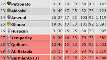 La otra lucha se da en el fondo de la tabla. Con cuatro equipos que perderán la categoría, son varios los que pelean fecha a fecha con el objetivo de mantenerse. Los más complicados son Sarmiento y Atlético Rafaela, en las posiciones del fondo y con su destino en el Nacional B casi asegurado. Quilmes, que ayer volvió a perder, quedó muy complicado. El que sigue dando pelea es Temperley, y Huracán asoma en ese pelotón del fondo: tiene apenas un punto más que el gasolero.