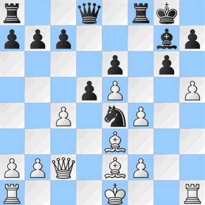 1.d4 g6 2.c4 Ag7 3.Cc3 d6 4.Cf3 Cf6 5.e4 0-0 6.Ae2 Ag4 7.Ae3 Cc6 8.d5 Axf3 9.gxf3 Cb8 10.h4 e5 11.dxe6 fxe6 12.f4 Cbd7 13.h5 Cc5 14.e5 Cfe4 15.Cxe4 Cxe4 16.Dc2 d5 (VER DIAGRAMA)