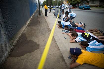 Algunos argentinos, otros hijos de argentinos que residen acá y también latinos en general: un ejército de adolescentes y jóvenes hace cuerpo a tierra contra el cordón de la vereda para espiar. ¿Cómo? Por el pequeño espacio que hay entre la lona y el piso. No hay más de diez metros entre ellos y Éver Banega, que hace un comentario sobre la indicación que le está dando el técnico. Uno lo llama a Messi a los gritos: no tendrá respuesta, porque el capitán está a unos cien metros de esta esquina del predio, trabajando con el kinésiólogo Luis García.