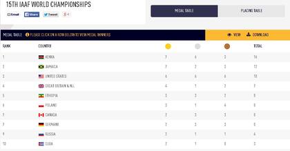 Con siete oros, seis platas y tres bronces (dieciséis preseas en total), el país africano lideró por primera vez una clasificación por países; Estados Unidos quedó en la tercera posición y Rusia, que fue segunda hace dos años en Moscú, terminó novena.
