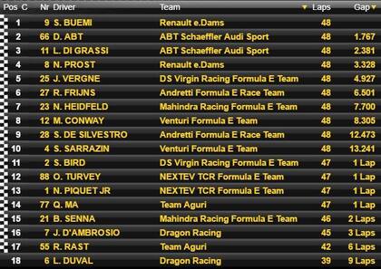 Buemi acabó ganando la carrera sin problemas, por delante del alemán Daniel Abt. El brasileño Di Grassi, líder del campeonato, dispone ahora de un solo punto de ventaja sobre Buemi.