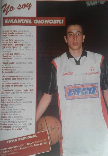 En la página 15 de aquella revista Manu se presenta como hincha de Chicago Bulls, admirador de Michael Jordan y Juan Espil. Dice que su virtud es el "tiro externo" y sus defectos "la defensa, el físico y algunos más". Aclara que jugar en la Liga es un sueño cumplido y que hacerlo con la selección nacional es un sueño pendiente, además de mencionar que le gustan las películas de Steven Spielberg y los libros de Sidney Sheldon.