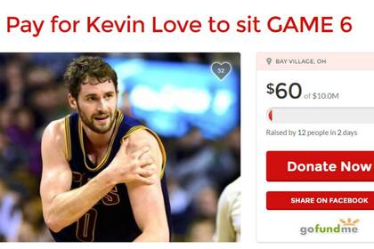 El flojo nivel mostrado por Kevin Love en las finales de la NBA colmó la paciencia de los aficionados de Cleveland , que quieren que el ala-pivote no juegue el sexto partido que se va a disputar este jueves en el Quicken Loans Arena. Un hincha de los Cavaliers comenzó una campaña para recaudar fondos para pagarle a Love 10 millones de dólares para que se pase sentado todo el partido. Horas antes del inicio del encuentro, se han recaudado tan sólo 60 dólares.