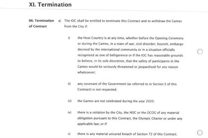 El primer inciso del artículo 66 del contrato habla de que se podría finalizar si "el país anfitrión se encuentra en cualquier momento, ya sea antes de la Ceremonia de Apertura o durante los Juegos, en estado de guerra, desorden civil, boicot, embargo decretado por la comunidad internacional o en una situación oficialmente reconocida como de beligerancia o si el el COI tiene motivos razonables para creer, a su exclusivo criterio, que la seguridad de los participantes en los Juegos se vería seriamente amenazada o en peligro por cualquier motivo".