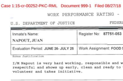 Según la evaluación de trabajo que hace la Oficina Federal de Prisiones, el paraguayo Napout, quien se encuentra dentro de una cárcel de Brooklyn, trabaja siete horas al día, de lunes a viernes, en la cocina del centro correccional. En aproximadamente un mes de trabajo, de mediados de junio a mediados de julio, ganó $19.32 dólares.