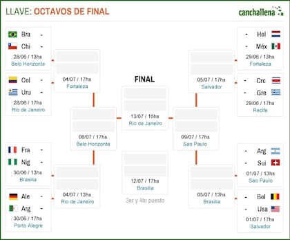 La Argentina enfrentará a Suiza el próximo martes a las 13. Si avanza, enfrentará al ganador de Estados Unidos contra Bélgica. Holanda, por su parte, si derrota a México chocará contra Costa Rica o Grecia.