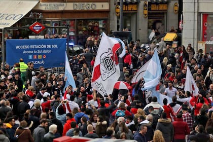 Una corriente de color rojo y blanco, con la hinchada de River, copó la emblemática Puerta del Sol e hizo su acampada a los pies mismos del popular monumento del Oso y del Madroño, el escudo de la ciudad.