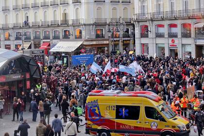 MADRID.- Nunca se había visto algo así. Tanto la céntrica Puerta del Sol como una de las esquinas más emblemáticas del barrio de Salamanca, en esta ciudad, fueron literalmente "tomadas" por hinchas de los dos equipos que se enfrentan en el super clásico por la Copa Libertadores.