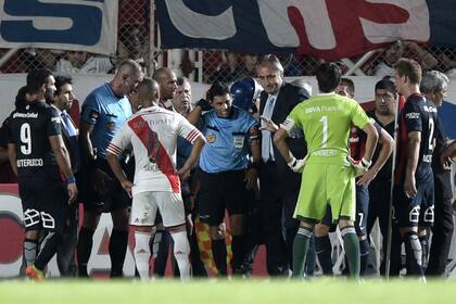 Era corner para el Ciclón, pero de repente, todo se detuvo. El juez de línea Juan Pablo Belatti le hizo señas al árbitro Néstor PItana de que le había pasado algo: un proyectil arrojado desde la platea descubierta del Nuevo Gasómetro le había pegado en la nuca.