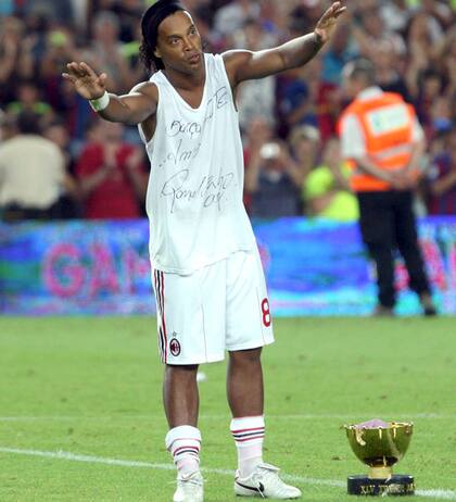 Incluso se acercó a una niña que ubicada en la primera fila desplegó una bandera que rezaba: "Ronaldinho te amo, cásate conmigo", tras lo cual abrazó uno por uno a sus ex compañeros del Barcelona y en especial a Messi. "Fue como volver a casa", comentó más tarde el brasileño.