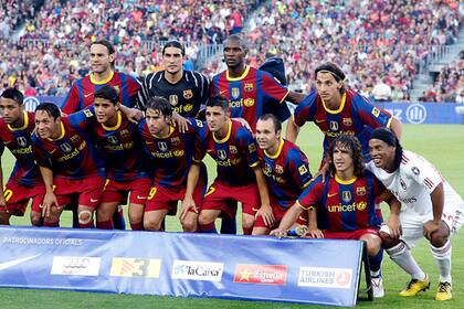 Ronaldinho pisó el césped en soledad, después del resto de los futbolistas que iniciaron el partido. Recibió una ovación y hasta posó para las fotos junto a los once futbolistas del Barcelona.