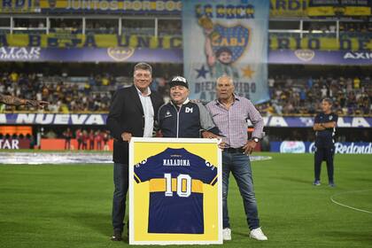 Sin la presencia de Jorge Ameal, Mario Pergolini o Juan Román Riquelme, y delante de un telón gigante con los colores de Boca dispuesto en el mediocampo, dos símbolos del club recibieron a Diego con los brazos abiertos: Miguel Angel Brindisi y Hugo Osmar Perotti.