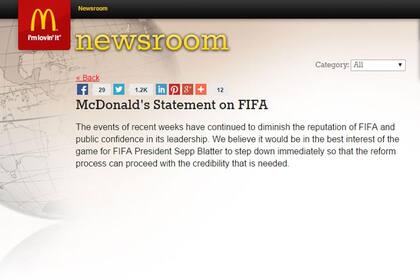 Coca-Cola, McDonald’s, Budweiser y VISA coordinaron comunicados sucesivos, todos exigiendo la renuncia "inmediata" del presidente de la FIFA ante el "daño" que genera a la "reputación" de la entidad.