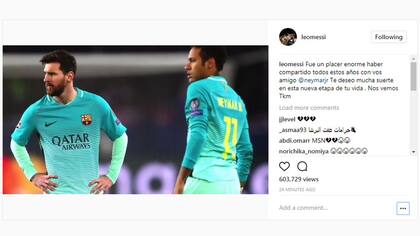 "Fue un placer enorme haber compartido todos estos años con vos amigo. Te deseo mucha suerte en esta nueva etapa de tu vida. Nos vemos, Tkm", con esas palabras, Lionel Messi, el capitán de Barcelona, despidió del club a Neymar, su amigo dentro y fuera de la cancha. La Pulga fue uno de los jugadores que decidió saludar en redes sociales al brasileño, quien este miércoles anunció que no jugará más en el conjunto español.
