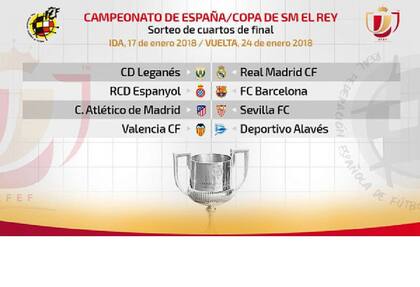El sorteo de los cuartos de final de la Copa del Rey española deparó hoy el cásico entre Barcelona y Espanyol, el duelo entre Real Madrid y Leganés y un choque de altura entre el Atlético de Madrid y el Sevilla. el cuarto choque lo protagonizarán Valencia y Alavés, finalista la temporada pasada frente al Barcelona.