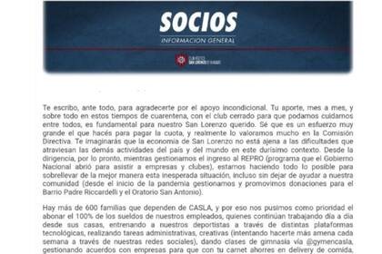 "Te escribo para agradecerte el apoyo incondicional. Tu aporte, mes a mes, y sobre todo en estos tiempos de cuarentena, con el club cerrado para que podamos cuidarnos entre todos, es fundamental para nuestro San Lorenzo querido. Sé que es un esfuerzo muy grande el que hacés para pagar la cuota, y realmente lo valoramos mucho en la Comisión Directiva. Te imaginarás que la economía de San Lorenzo no está ajena a las dificultades que atraviesan las demás actividades del país y del mundo en este durísimo contexto. Desde la dirigencia, por lo pronto, mientras gestionamos el ingreso al REPRO (programa que el Gobierno Nacional abrió para asistir a empresas y clubes) estamos haciendo todo lo posible para sobrellevar de la mejor manera esta inesperada situación incluso sin dejar de ayudar a nuestra comunidad (desde el inicio de la pandemia gestionamos y promovimos donaciones para el Barrio Padre Riccardelli y el Oratorio San Antonio)", sigue la carta.
