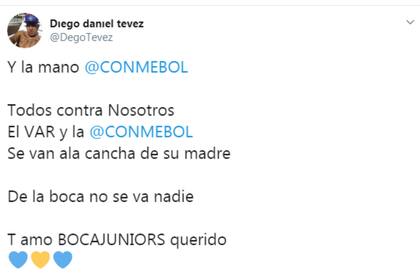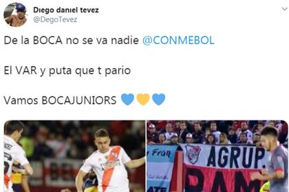 Activo en las redes sociales, siempre con mensajes de aliento para Boca o para su hermano, Diego Tevez publicó dos tuits amenazantes en las últimas horas en su cuenta de Twitter. El hermano de Carlos disparó contra el VAR y la Conmebol, por la actuación del árbitro Raphael Claus y la implementación de la tecnología en el clásico del último martes entre River y Boca. El clásico por la semifinal de la Copa Libertadores quedó en manos de River, que abrió el marcador producto de un penal señalado por el VAR. "Todos contra nosotros", publicó. Y añadió el amenazante "de la Boca no se va nadie".