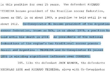 El último informe publicado por el Departamento de Justicia de Estados Unidos incluye a Julio Grondona como el "Co-Conspirador #1" de la investigación por el FIFAGate, aunque evita nombrarlo a lo largo de 240 fojas. "Fue un dirigente de alto rango en la AFA, la FIFA y Conmebol", dice al presentarlo. Después, señala que "fue presidente de AFA desde 1979 hasta su muerte en 2014". "Como pasó con el acusado Jack Warner, los acusados Nicolás Leoz y Ricardo Teixeira, junto con el Co-Conspirador #1, utilizaron su poder e influencia para enriquecerse ilegalmente", agregan.