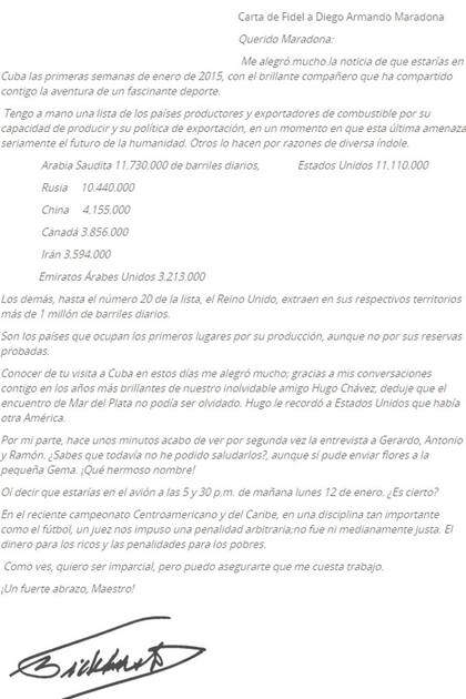 Maradona visitó ese mes la capital cubana para grabar el programa "De Zurda", que trasmite el canal venezolano Telesur, donde para disipar las dudas, mostró una carta que le había enviado Castro, aunque no reveló su contenido. Castro explicó en su artículo de hoy que sacaba a la luz "los textos completos" del intercambio para que "todo esté claro". "Gracias a mis conversaciones contigo en los años más brillantes de nuestro inolvidable amigo Hugo Chávez deduje que el encuentro de Mar del Plata no podía ser olvidado. Hugo recordó a Estados Unidos que había otra América", escribió Castro a Maradona en la carta con fecha del 11 de enero.