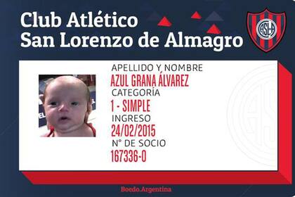 "Hoy en Avenida de Mayo, Rubén Darío Álvarez asoció a su hija, Azul Grana. ¡Qué no tiene explicación!", publicó San Lorenzo en su cuenta oficial de Twitter y dio a conocer el carnet de la flamante asociada.