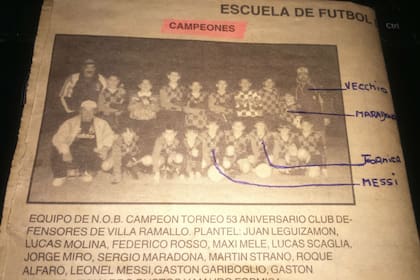 "Leonel (sic) Messi fue la gran figura del exitoso certamen, marcando 15 goles en seis partidos", recuerda el diario El Norte, al otro día de la final. Quince goles en seis partidos: la mitad de los que metió Newell’s. Doce clubes jugaron el torneo, que se dividió en tres zonas. El equipo de Vecchio debutó con un 10-0 a uno de los locales, Defensores C, después goleó 3-0 a Belgrano y 7-0 a Paraná, y finalmente vino la segunda ronda, los 5-0 de la semifinal y la final. En uno de ellos, porque Maradona metió goles en ambos, sucedió el partido del toque que todos hemos imaginado alguna vez: Maradona, Messi, Maradona. Viéndolo del lado de Leo, un encierro, más que una pared.