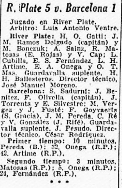 El plato fuerte era River-Barcelona. El césped estaba barroso, como describió LA NACION, algo que a lo que los europeos no estaban acostumbrados. Los españoles se pusieron en ventaja a los 10 minutos de juego con un tanto desde afuera del área de Pereda. Hugo Gatti, por entonces arquero millonario, tardó en reaccionar. Vestido con una camiseta verde hoja, el Loco había salido a la cancha con unos guantes de pecarí que se había comprado en la Avenida Santa Fe. Luego de que le marcaran, se los cambió por unos de crochet gris y pecarí, describió el diario del día después.