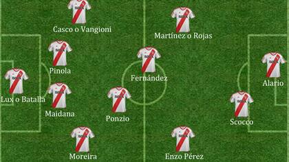Así, el posible equipo de River que podría armar Gallardo con los refuerzos que llegaron y los que pueden venir: Augusto Batalla o Germán Lux; Jorge Moreira, Jonatan Maidana, Javier Pinola, Milton Casco o Leonel Vangioni; Enzo Pérez, Ignacio Fernández, Leonardo Ponzio, Ignacio Fernández, Ariel Rojas o Gonzalo Martínez; Lucas Alario e Ignacio Scocco.