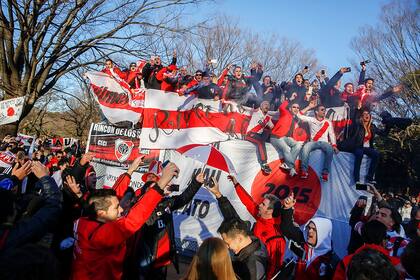 El japonés que dirige a la hinchada pic.twitter.com/QZmrG0loWN&— Pablo Hacker (@pablohac) diciembre 19, 2015El paisaje se llenó de banderas, de lejos se escuchaban las canciones de River. Había clima de Monumental como en el Parque Paseo de las Américas sobre la calle Monroe cuando hay partidos en Núñez. Era la familia riverplatense, una fiesta para todo público. Decenas de hinchas subieron sobre una estructura y empezaron a comandar la celebración. Camisetas, hasta bengalas y mucho color.