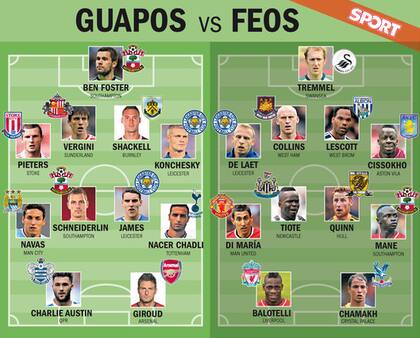 Según una encuesta de una casa de apuestas inglesas, de la que participaron 250 mujeres, Ángel Di María fue elegido como el jugador más feo de la Premier League . En el equipo de los lindos, figura un jugador argentino: Santiago Vergini , de Sunderland. El jugador más agraciado para las chicas es el francés Oliver Giroud , de Arsenal.