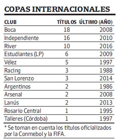 Boca es el líder del ranking de equipos argentinos con más títulos internacionales. Suma 18, dos más que Independiente, equipo que le sigue en el segundo puesto. En total son 12 los que alguna vez ganaron alguna copa internacional.