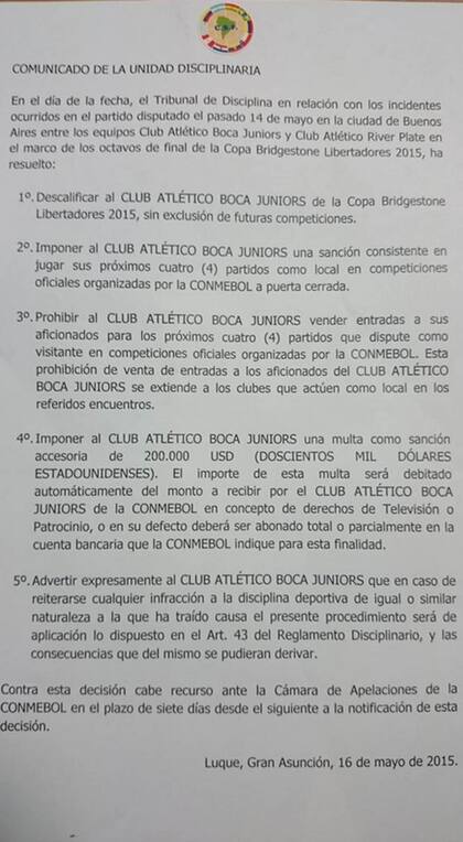 Había algo que se sabía de antemano: Boca estaba fuera de la Copa Libertadores 2015, tras el escándalo ante River , cuyos jugadores fueron agredidos con un producto químico en la Bombonera. Pero había algo que no estaba definido del todo: la sanción disciplinaria. Comparado con lo previsto, los xeneizes la sacaron muy barata, en medio de tironeos y conveniencias. No fueron ni un año ni dos de castigo. Es más, Boca podrá jugar los próximos campeonatos internacionales y ni siquiera tendrá que salir de la Bombonera. En limpio, además de descalificarlo de la competencia, la Conmebol sancionó al club de la Ribera con cuatro partidos a puertas cerradas como local, cuatro partidos sin su gente en condición de visitante y una multa de US$ 200.000. Fue un triunfo en los escritorios. A no dudarlo, pese a que Daniel Angelici ya anunció que apelará el fallo económico y los partidos sin gente en La Boca.