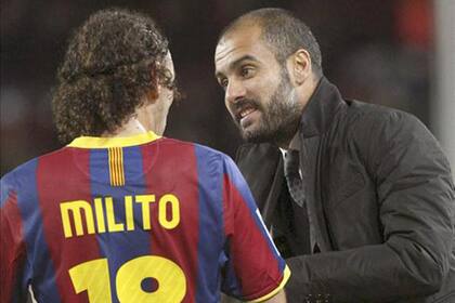 La primera charla técnica que tuvo que dar frente a un equipo fue en Abu Dhabi, cuando Barcelona jugó la final del Mundial de Clubes contra Estudiantes. Pep Guardiola le pidió que hable "porque conocía el carácter de los equipos sudamericanos". Se puso al frente ante jugadores de la talla de Lionel Messi, Andrés Iniesta, Xavi Hernández y Thierry Henry, entre otras grandes figuras. Finalmente, Barcelona ganó ese partido por 2-1, con el recordado gol de Leo. Con el pasar de los años, Milito forjó una gran amistad con Guardiola.