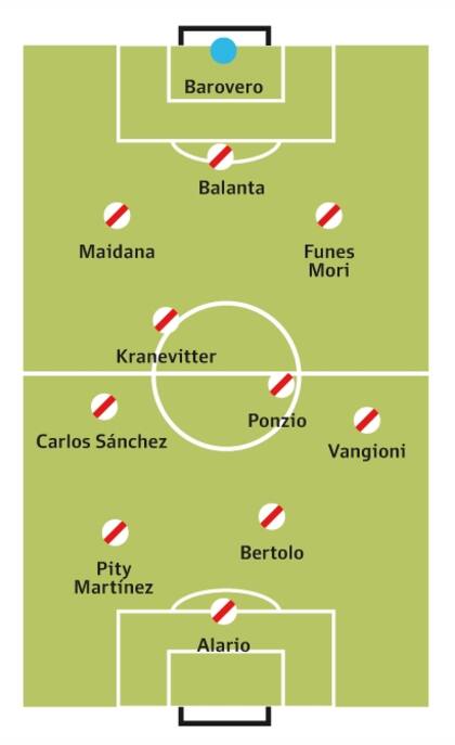 Pero si ninguno de los dos termina de convencerlo al DT como variable para el lateral derecho porque (entre otras cosas) no quiere perder altura para el juego aéreo de las pelotas paradas a favor y en contra, otra alternativa podría ser recurrir a Balanta como líbero por detrás de Maidana y Funes Mori, pero ahí ya debería cambiar el esquema al 3-4-2-1 para que Sánchez y Vangioni se mantengan sobre las bandas, Ponzio y Kranevitter como doble 5 y mantendría a Pity Martínez y Bertolo más adelantados como socios de ataque de Lucas Alario.