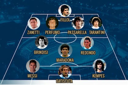 Ubaldo Matildo Fillol ocupa el arco. Javier Zanetti, Roberto Perfumo , Daniel Passarella y Alberto Tarantini forman la defensa. Miguel Ángel Brindisi y Fernando Redondo inician la línea del mediocampo, con Diego Armando Maradona más adelantado. En el ataque se ubican Lionel Messi, Gabriel Batistuta y Mario Alberto Kempes. Todos los entrenadores consultados optaron por el sistema 4-3-3.