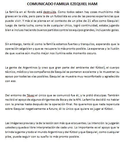 En un comunicado difundido este mediodía, la familia de Ezequiel Ham, el futbolista de Argentinos Juniors fracturado por Carlos Tevez, rompió el silencio. En un escrito de cinco párrafos, admitieron que están destruidos, pero que saldrán adelante. Y fueron ambiguos al referirse a la intención de Carlos Tevez en la jugada que lesionó a Ham : "Las imágenes previas y las de la lesión son más que elocuentes. La intención la juzgarán ustedes".