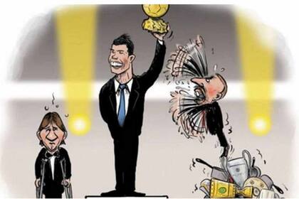 Siguen los coletazos de la consagración de Cristiano Ronaldo en el Balón de Oro 2013. La revista France Football, que entrega el premio junto a la FIFA, publicó una particular caricatura para describir lo que ocurrió en la votación. Puso obviamente al portugués en lo más alto del podio y debajo a Lionel Messi en muletas y a Franck Ribéry parado sobre todos los títulos que ganó en 2013, que de poco le sirvieron para alcanzar el premio.