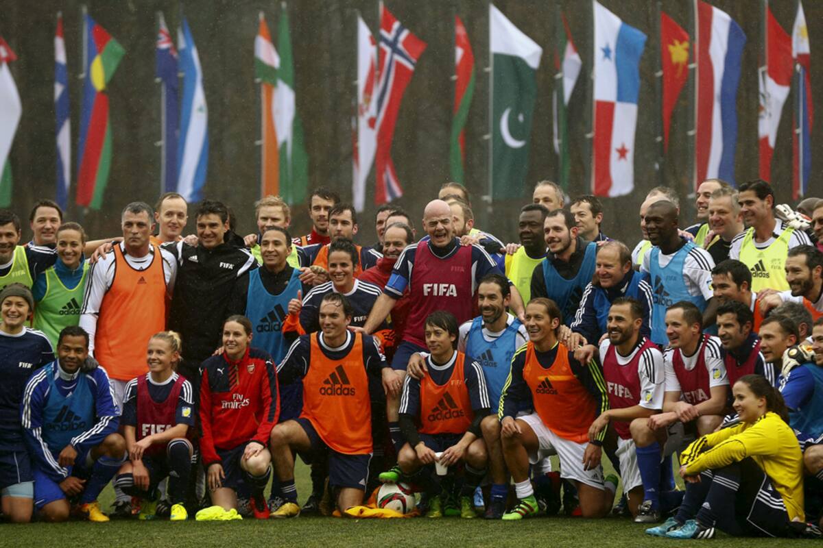 Los españoles Carles Puyol y Michel Salgado, los italianos Fabio Cannavaro y Paolo Maldini, el holandés Clarence Seedorf, el ucraniano Andréi Shevchenko y el francés Robert Pires fueron algunos de los exfutbolistas que felicitaron al nuevo presidente, que se visitó de corto y con una pechera de la FIFA disfrutó junto a ellos de la disputa del partido.
