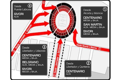 Por Quinteros y Libertador se ingresará exclusivamente a la tribuna Centenario alta. Por el Puente Labruna (desde Ciudad Universitaria) el acceso será exclusivo para la tribuna Sívori alta, donde habitualmente se ubica el grueso de la hinchada millonaria.