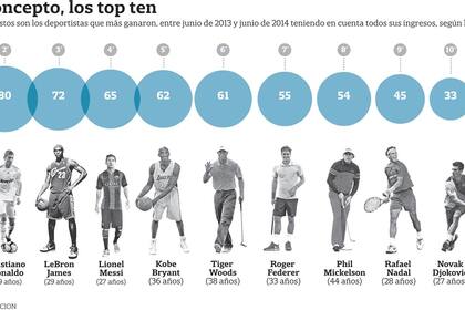 El del tenis es otro mundo que refleja como pocos la explosión económica del deporte. Roger Federer terminó el ciclo de junio 2013 a junio 2014 séptimo entre quienes más dinero obtuvieron. Fueron, por todo concepto, 55 millones de dólares, pese a los contratiempos físicos y la falta de confianza. Este año, con una sensible mejora de rendimiento, sobre todo a partir de la final de Wimbledon, no computada en el informe de Forbes, se estima que ya igualó esa cifra. En total, el suizo habría acumulado 600 millones de dólares.