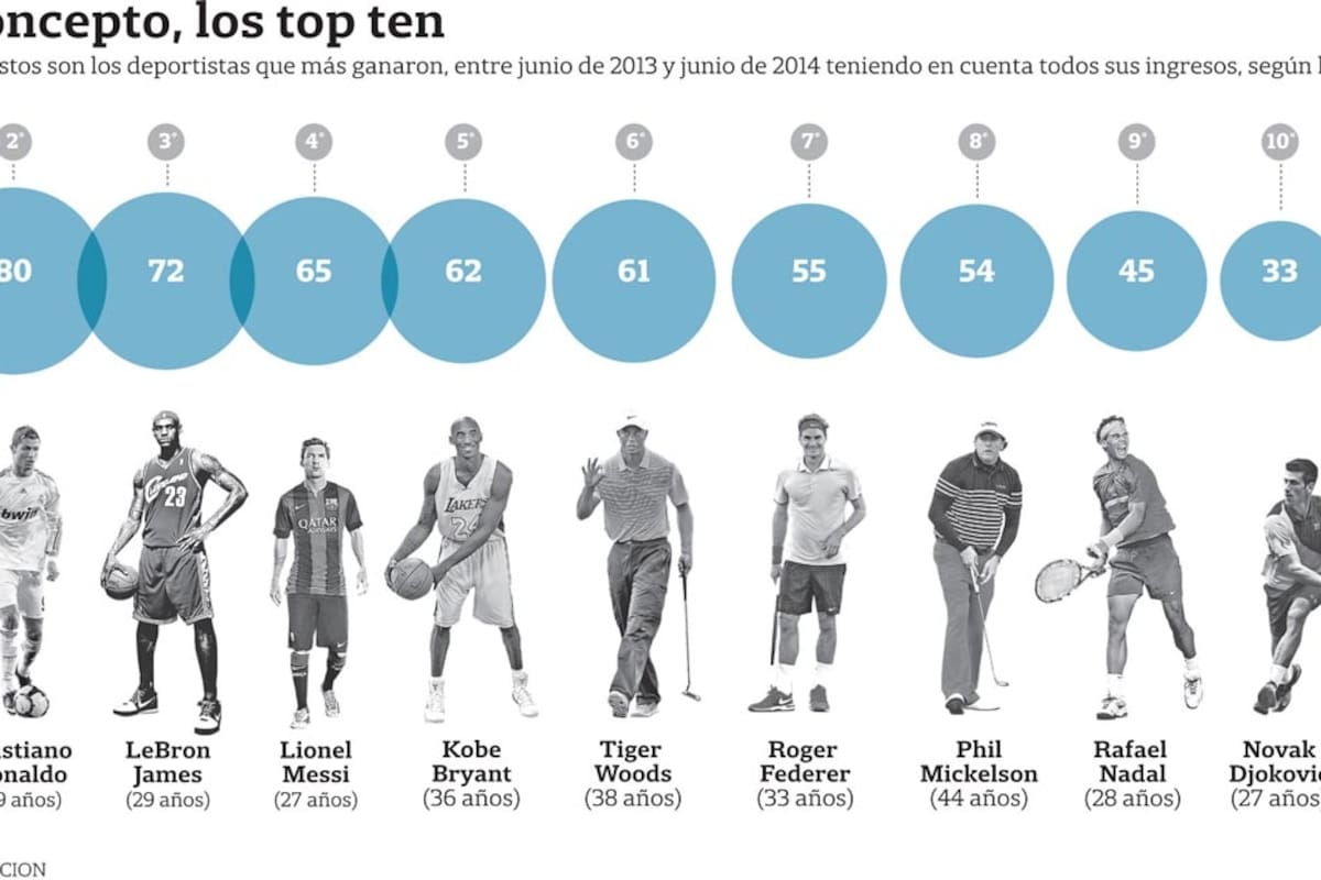 Lo siguen dos delanteros: Sergio Agüero , en Manchester City, con 12 millones, y Carlos Tevez , en Juventus, con 9 millones. Entre los argentinos, el único en mezclarse entre los más ricos del fútbol es Luis Scola . Los poco más de 11 millones de dólares que recibe el ala pivote de Indiana están lejos de los 72 que embolsa LeBron James. Tercero en el ranking general, el número 1 en ganancias de la NBA no está solo como basquetbolista en la decena más millonaria: Kobe Bryant ocupa el 5° lugar, con 62 millones de dólares.