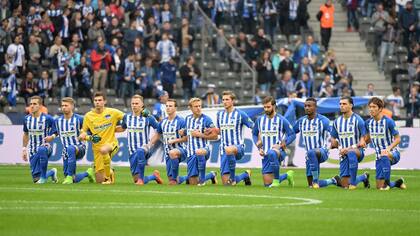 Los once futbolistas, el cuerpo técnico encabezado por el entrenador Pal Dardai y dirigentes del club, incluido el gerente Michael Preetz, se pusieron de rodillas y se unieron de la mano antes del inicio del duelo con el Schalke por la octava fecha de la Bundesliga.