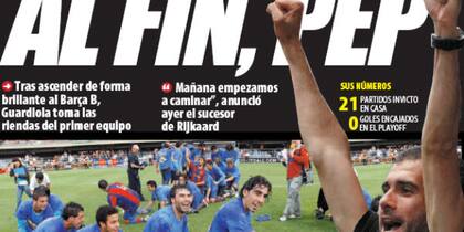 "Al fin, Pep". "Pep, por la puerta grande". Los títulos del 16 de junio de 2008 fueron dedicados exclusivamente a él. Un día antes, Barcelona B (con futbolistas como Sergio Busquets y Pedro) había conseguido el ascenso a Segunda B, desde la Tercera División. Con gol de Víctor Vázquez, el equipo filial dirigido por Guardiola, derrotó a 1-0 a Barbastro y regresó a la tercera categoría del fútbol español, en lo que significó el primer título de Pep Guardiola y el pasaporte al primer equipo, del que se haría cargo días después.